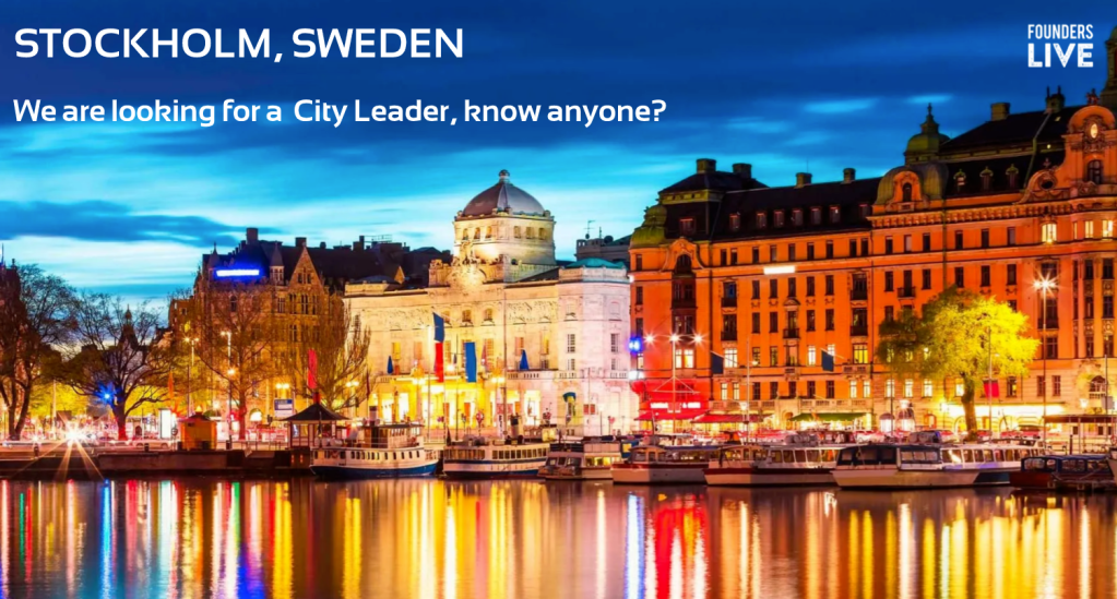 Founders Live is launching soon in Stockholm and is now looking to add a City Leader to help run the event in the Nordic region. Founders Live is a fun livestreamed startup event and pitch competition which highlights promising early-stage startups from specific regions, where winners gain recognition not only in the local community but across the global Founders Live social platform.